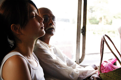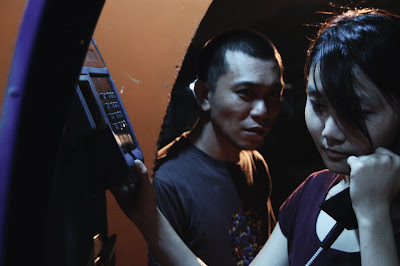 The film introduces its protagonist Ah Ping (Carol Ong) in a typically odd and funny scene on a train in which she gives up her seat to an old man (Gandii Nathen) with a mess of carry-on baggage who complains of a headache. She is traveling a long way from home, for reasons we can’t quite discern, to work in a restaurant run by her aunt Hong Jie (Ho Chi Lai). Ah Ping rooms with her grade-school aged niece Mei (Leong Jiun Jiun), who has been carrying on a pen-pal correspondence with someone she calls “Mystery Man,” and this long-distance relationship parallels the equally mysterious and unsettling relationship Ah Ping later has with John (Stephen Chua), a gangster whose vaguely shady activities are kept mostly off-screen. Ah Ping has a boyfriend back home that she calls often at a red pay phone, a recurring setting in the film. This is where she meets John, who doggedly stalks her and more or less kidnaps her, driving her to his grandmother’s house, introducing her as his wife. Ah Ping resists at first but passively and cheerfully (as indicated by the word “cheerful” on a T-shirt she often wears) goes along with her abduction. John introduces her to his cousin Gary (Ramanamohan), who he says is a pimp and often scams women he meets, forcing them into prostitution, and eventually selling them to human traffickers. “They think their love can conquer all,” is John’s cynical evaluation of Gary’s victims. As things progress, we feel a sense of dread and inevitability as Ah Ping seems to be headed inexorably toward the same fate.